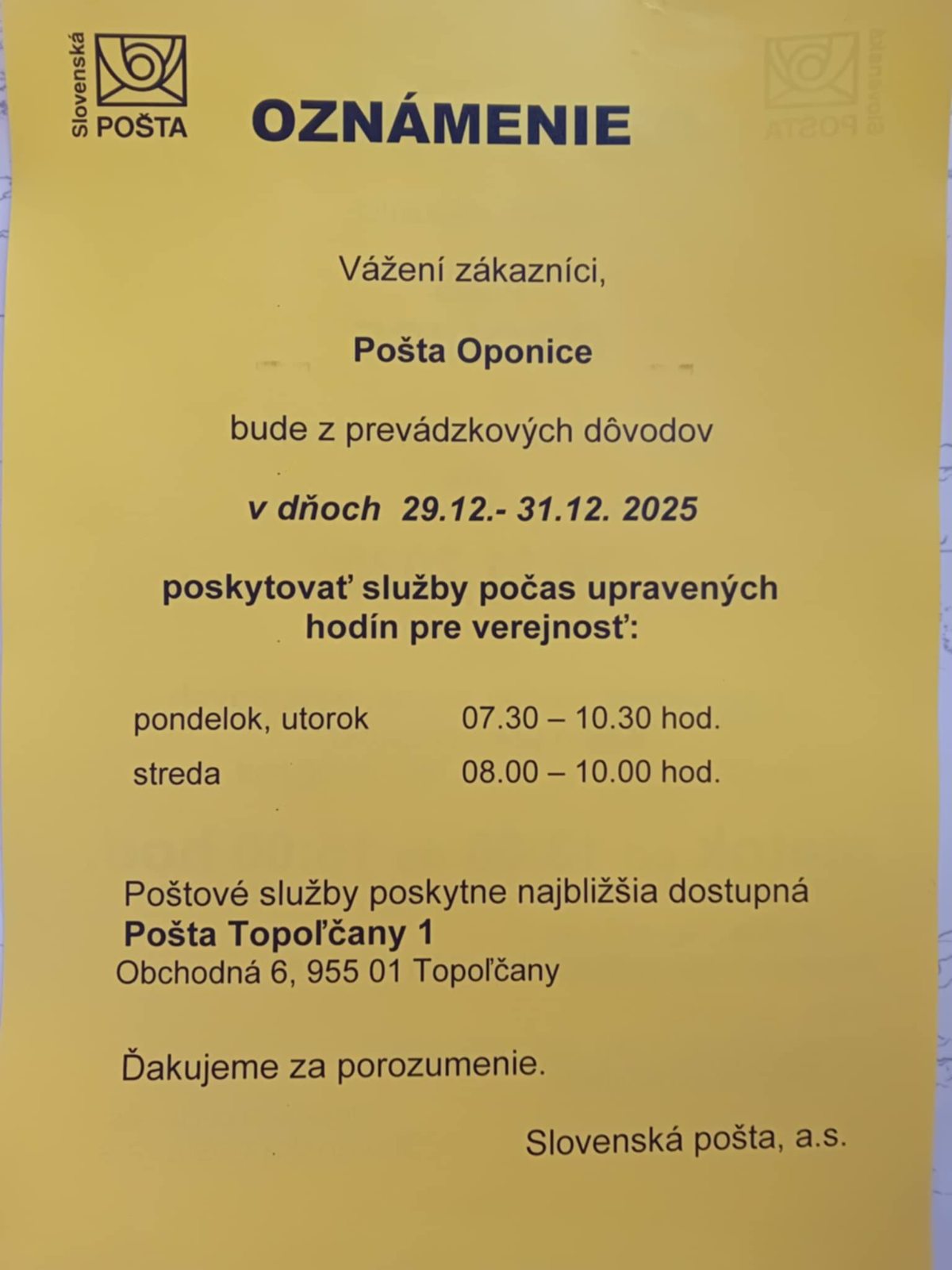 Pošta Oponice - upravené hodiny pre verejnosť 29.12. až 31.12. 2025